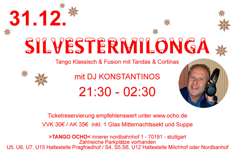 „SILVESTER IM TANGO OCHO “ mit DJ Kostantinos Gemeinsam ins neue Jahr tanzen Wir laden euch herzlich ein, den Jahreswechsel im stimmungsvollen Ambiente des >TANGO OCHO< zu feiern. Unsere große Tanzfläche, das flair der Wagenhallen und die stimmungsvolle Dekoration und Beleuchtung bieten den idealen Rahmen für eine schöne und energievolle Silvesternacht. DJ Konstantinos aus Ulm […]